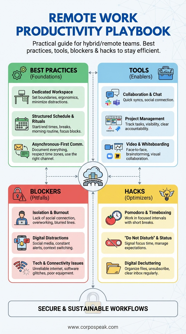 Practical guide for hybrid/remote workers and teams. Best practices, tools, blockers & hacks to stay efficient.